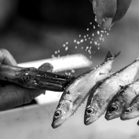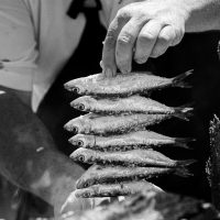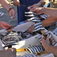 El ESPETO DE MÁLAGA consiste en un conjunto de sardinas (óptimo entre 6 a 12 unidades) que se atraviesan con una caña de cañaveral.
